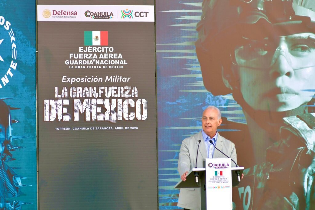 Este miércoles, el gobernador Manolo Jiménez Salinas, inauguró junto al alcalde Román Alberto Cepeda González; el General de División E.M. Fernando Colchado Gómez; y el general Juan Carlos Quiroz Muñoz, comandante de la VI Zona Militar; la Exposición Militar “La Gran Fuerza de México”, en el Centro de Convenciones de Torreón. Evento que se realiza por primera vez en todo el país este 2026.