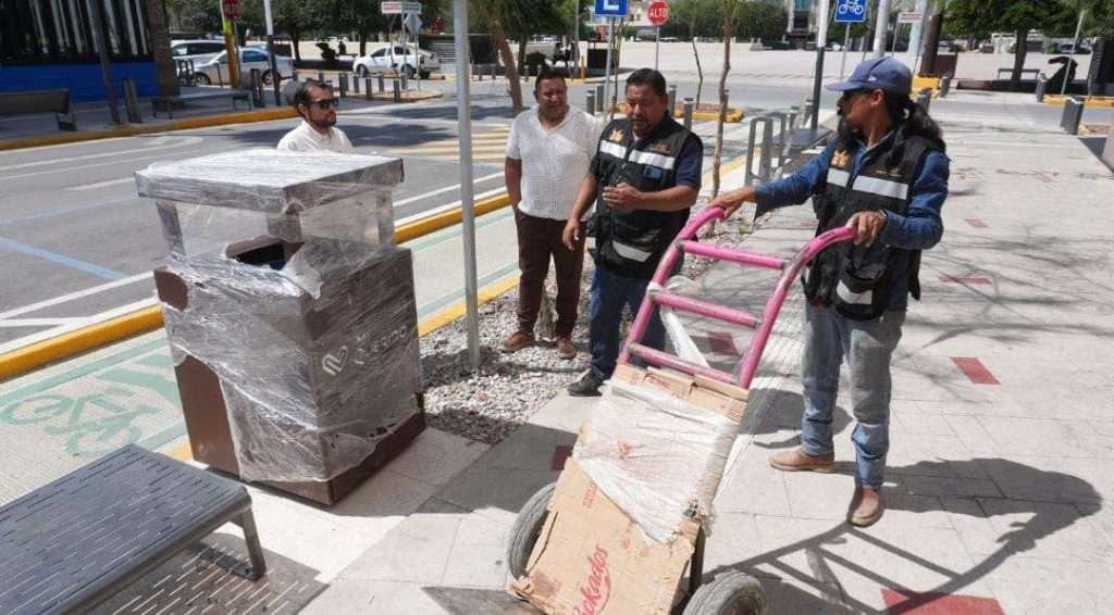Torreón, Coahuila. A 6 de octubre de 2025.- La Administración Municipal, a través de las direcciones generales de Servicios Públicos y Obras Públicas, realizan la instalación de nuevos contenedores metálicos de basura en los principales espacios del Centro Histórico de Torreón.